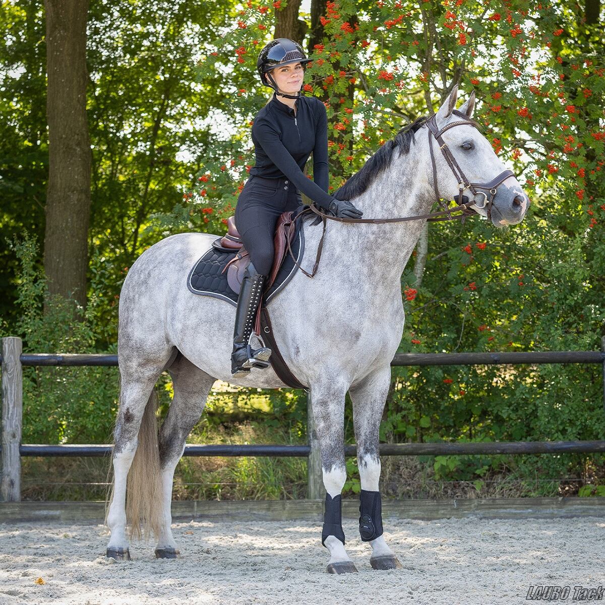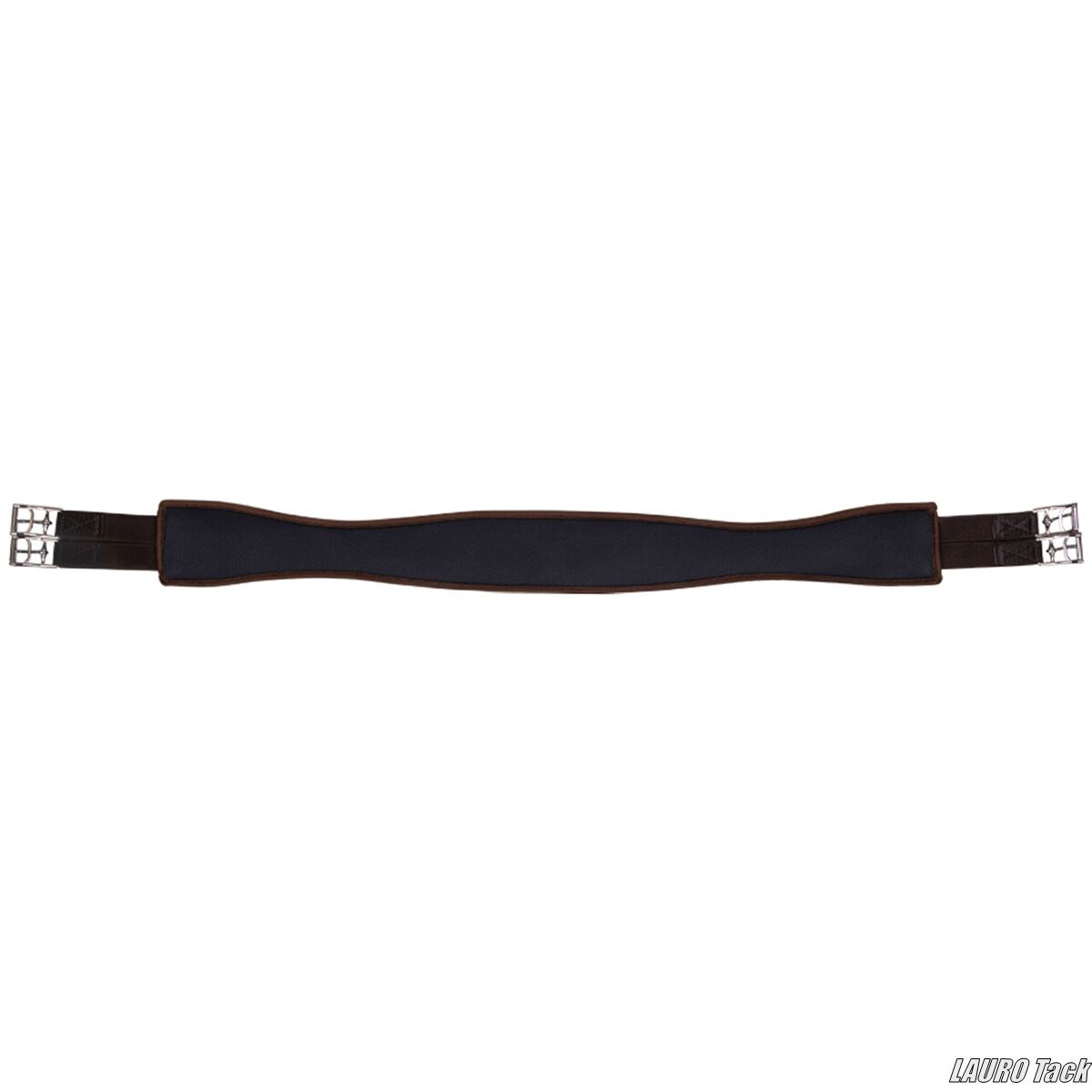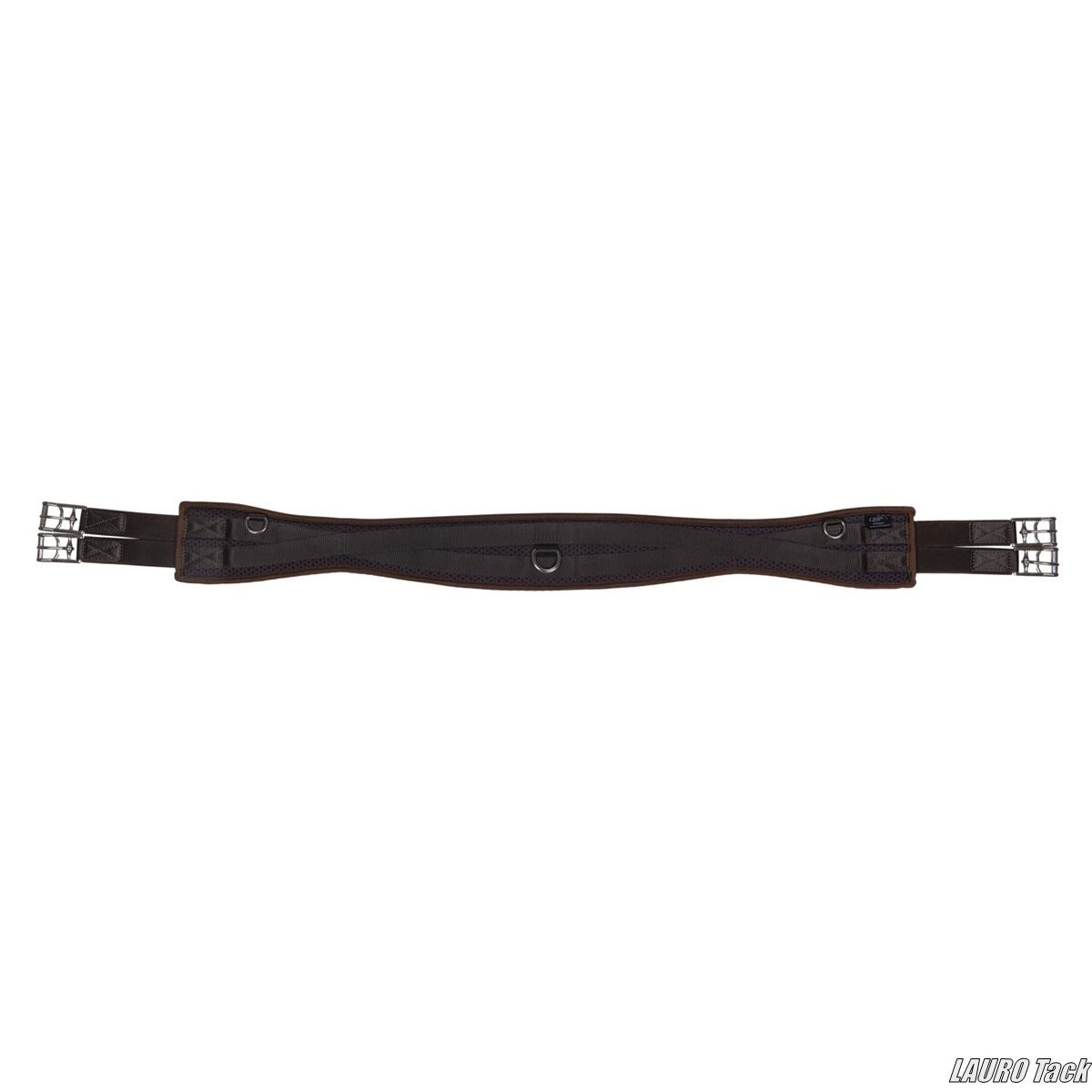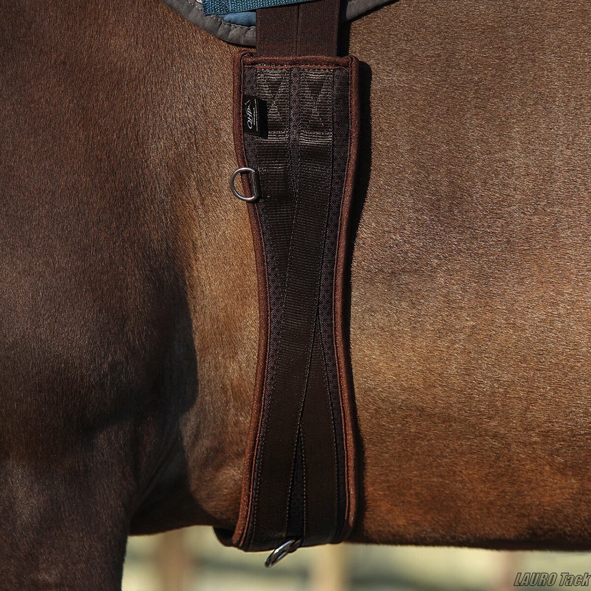 QHPの腹帯です。複数の素材を重ねた構造です。外側はポリエステルメッシュを使用しています。通気性のある裏地で馬が蒸れにくい設計です。中間層にはAir Cycleネオプレンを使用しています。リサイクル素材で通気性があり衝撃を吸収します。ステンレススチール製ローラー付きバックルが付いています。素材はポリエステルです。