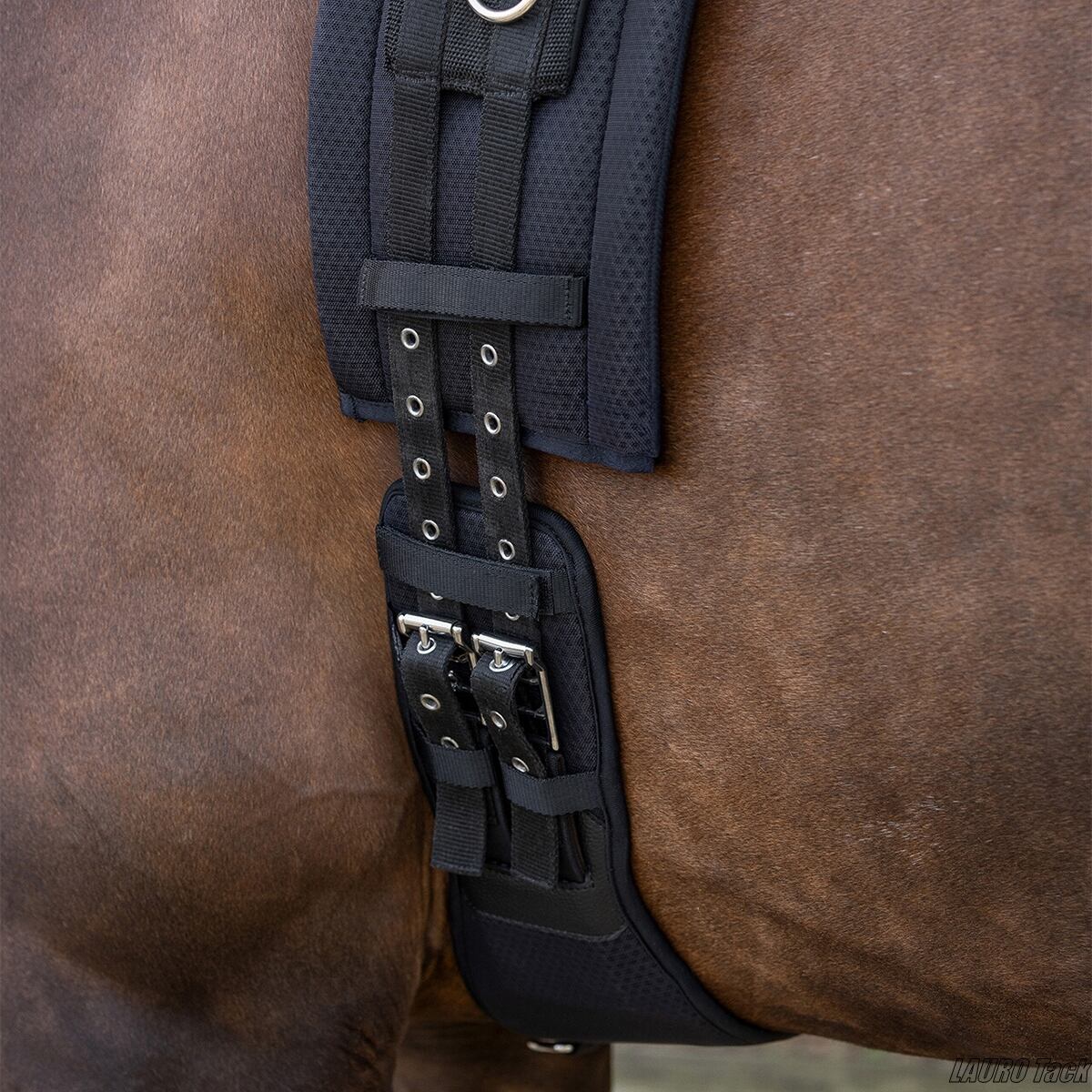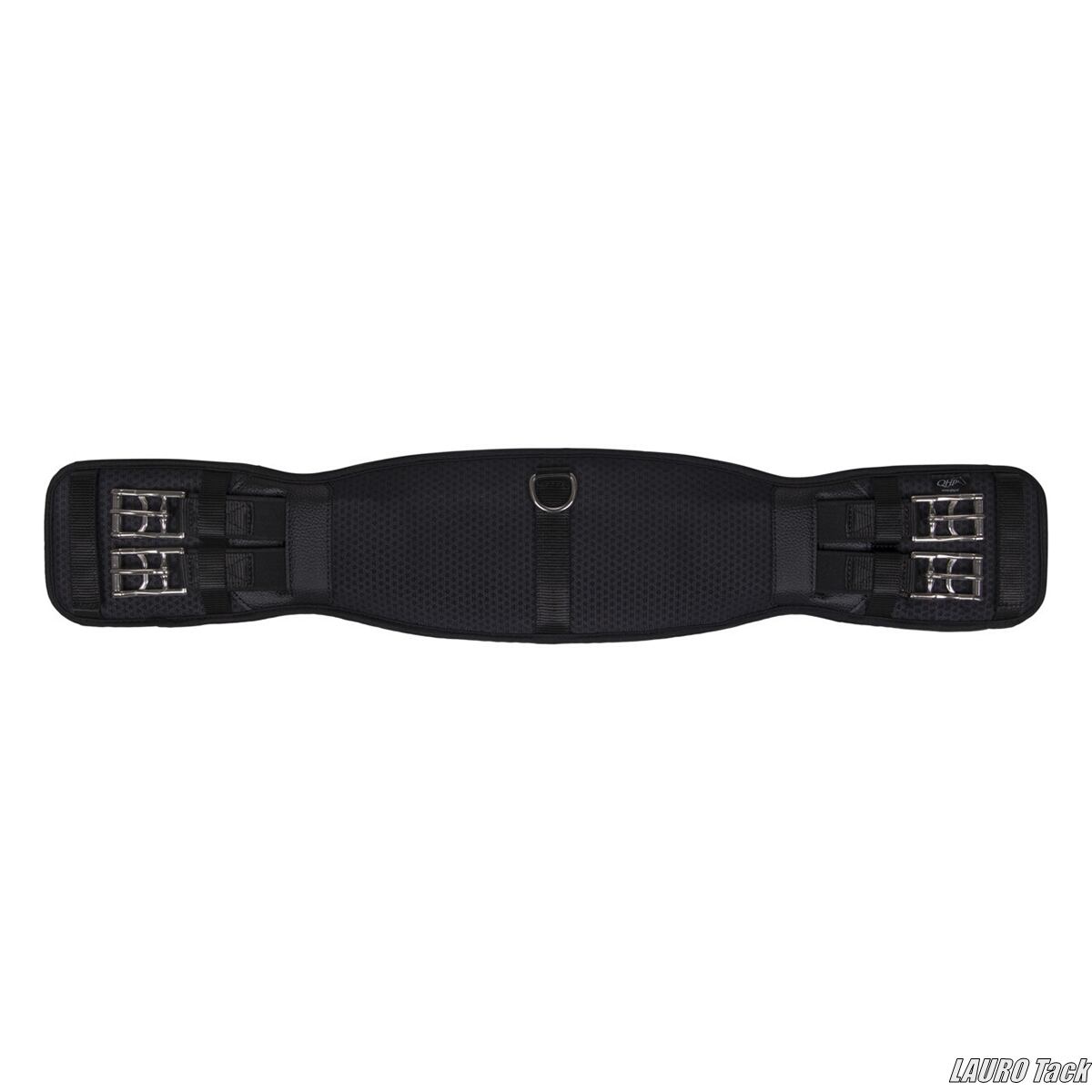 QHPの馬場鞍用腹帯です。複数の素材を重ねた構造です。外側はポリエステルメッシュを使用しています。通気性のある裏地で馬が蒸れにくい設計です。中間層にはAir Cycleネオプレンを使用しています。リサイクル素材で通気性があり衝撃を吸収します。ステンレススチール製ローラー付きバックルが付いています。素材はポリエステルです。