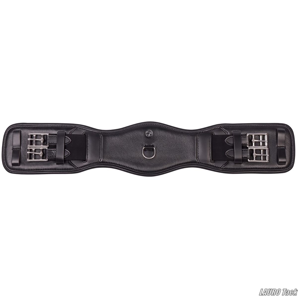 Harry's Horseの馬場鞍用腹帯です。ゴム入りで裏地付きの構造です。馬の快適性を考えた設計です。ステンレススチール製ローラー付きバックルが付いています。補助手綱を取り付けるためのDリングが付いています。