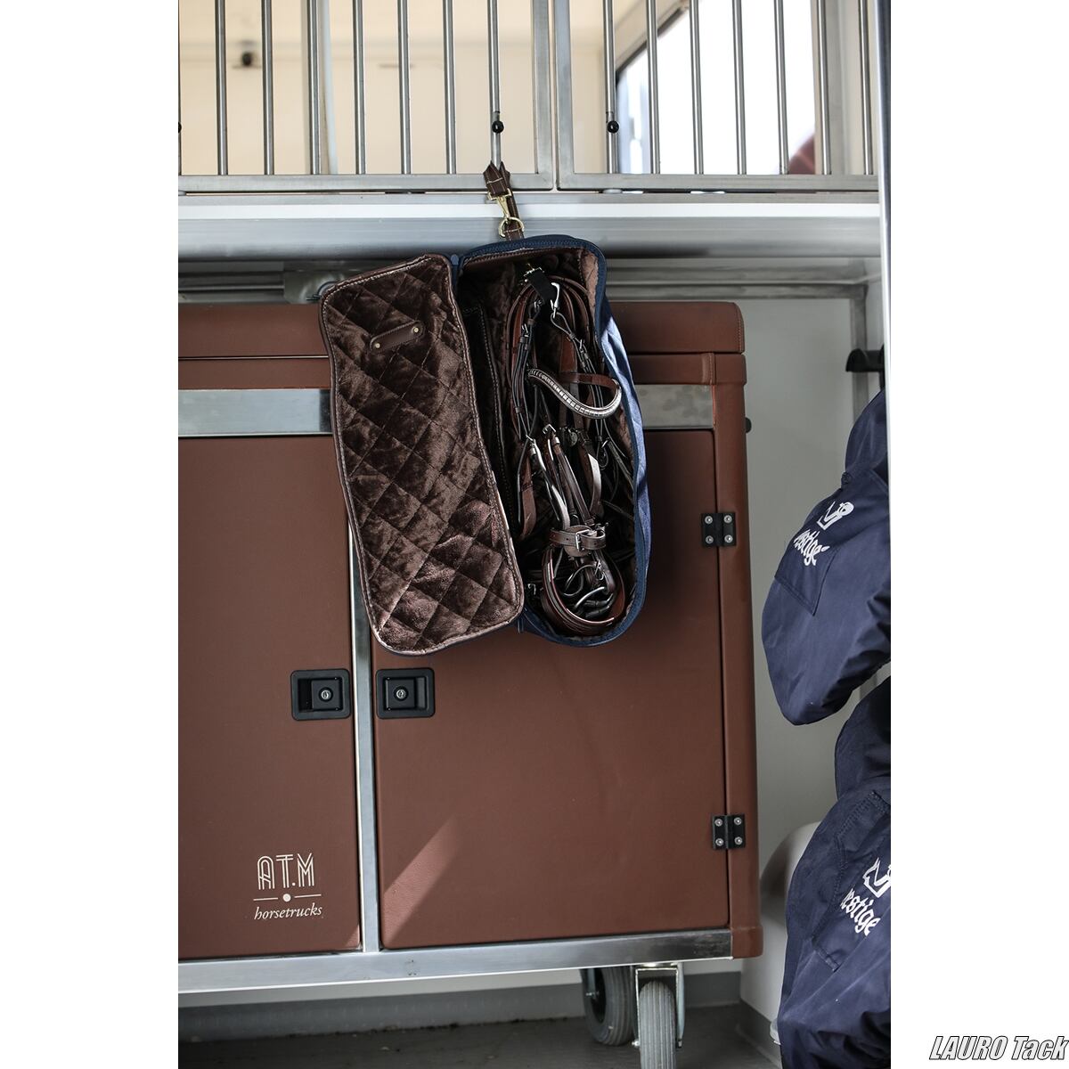 高級感のあるデザインが魅力のKentuckyの頭絡バッグ。内側には非常に柔らかい人工ラビットファーを使用し、頭絡を傷から守ります。クリップ式の開閉で扱いやすく、内側のフックで頭絡を吊るして収納可能。ダイヤモンドキルティングが上品な印象を与え、ネームタグの刻印にも対応しています。他のKentucky製品とも統一感のあるデザインです。