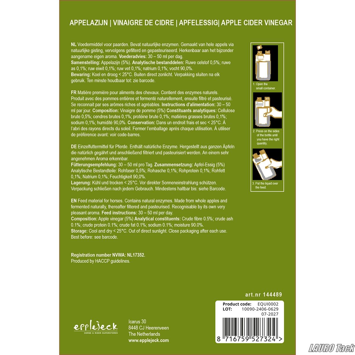 体調管理をサポートするEpplejeckのリンゴ酢。自然発酵によって作られたアップルサイダービネガーを使用し、ビタミンやミネラルを含みます。日々のコンディション維持や体調管理に役立ち、飼料に混ぜて与えることができます。内容量は1リットルです。