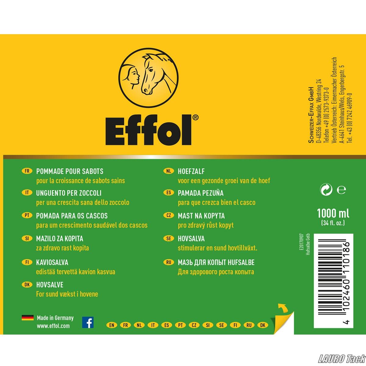 蹄のケアに適したEffolの蹄用軟膏。月桂樹オイルとワセリンを配合し、蹄の奥まで浸透してしなやかさを保ちます。柔軟で弾力のある蹄の維持をサポートし、日常のケアに適しています。