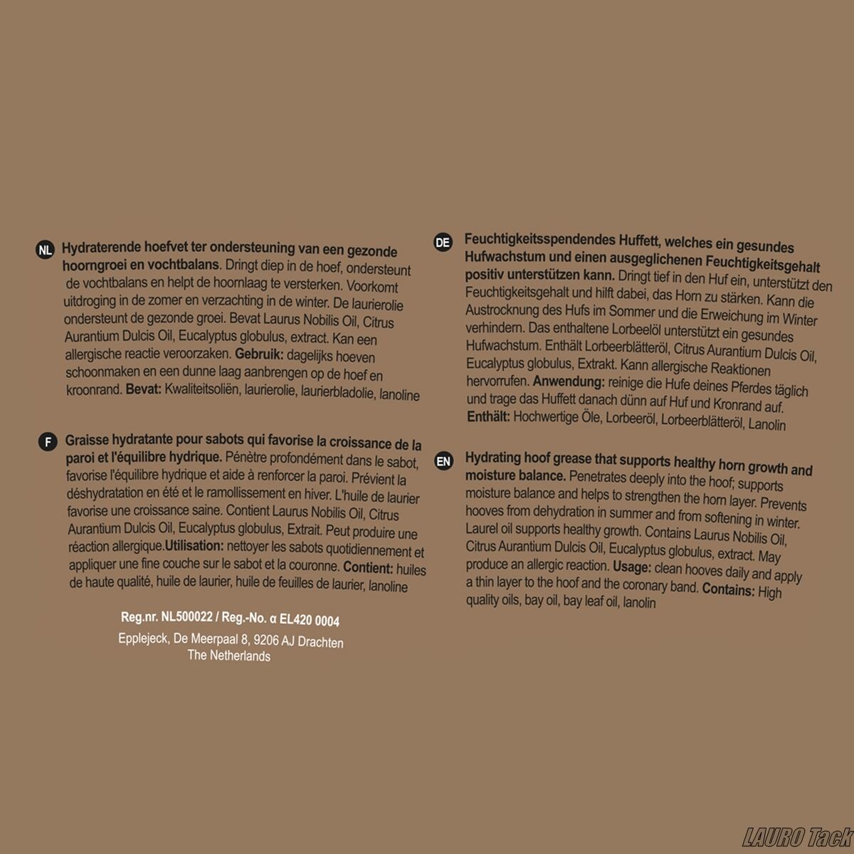 蹄の保護とツヤ出しに適したEpplejeckの蹄用クリーム。ワセリンや月桂樹オイル、ラノリンを配合し、適切な水分バランスを保ちながら健康的な蹄壁の維持をサポートします。日常のケアで美しいツヤのある仕上がりに整えます。