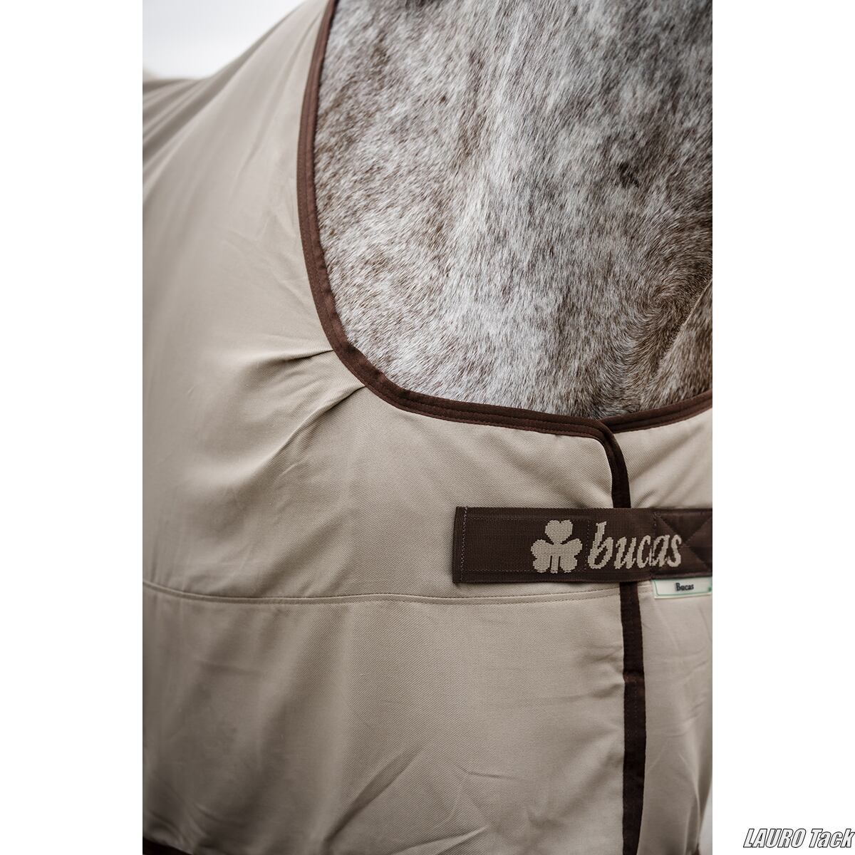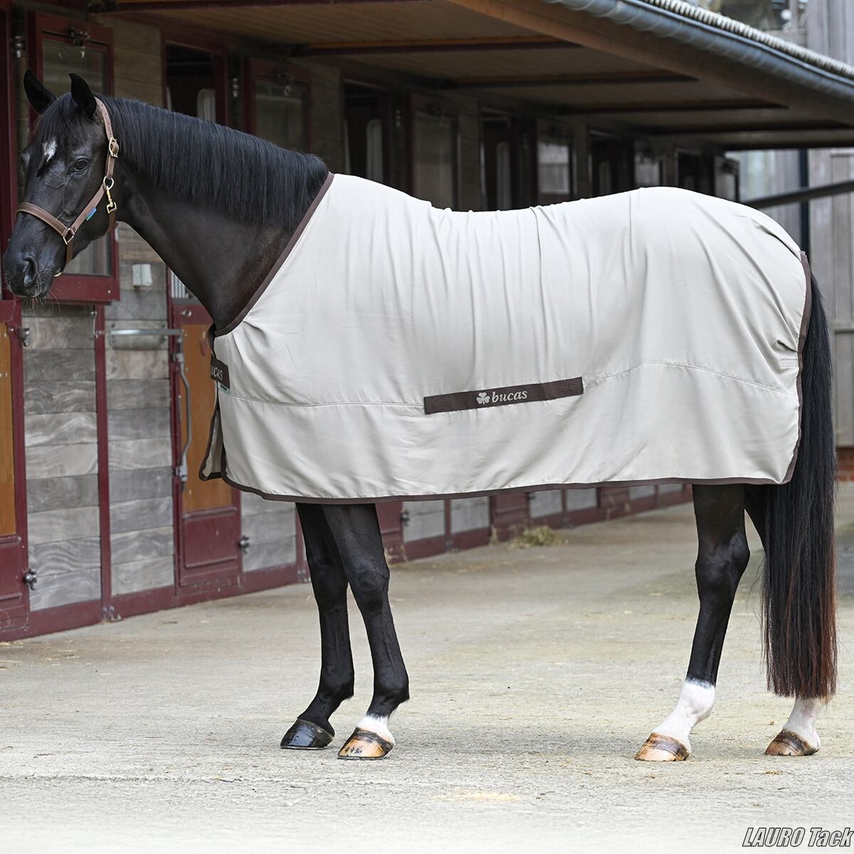 汗抜きやクールダウンに適したBucasのリネン素材クーラー馬着。通気性に優れた天然素材を使用し、抗菌性にも配慮されています。肩の動きを妨げにくい設計と調整可能なベルトで快適にフィットします。