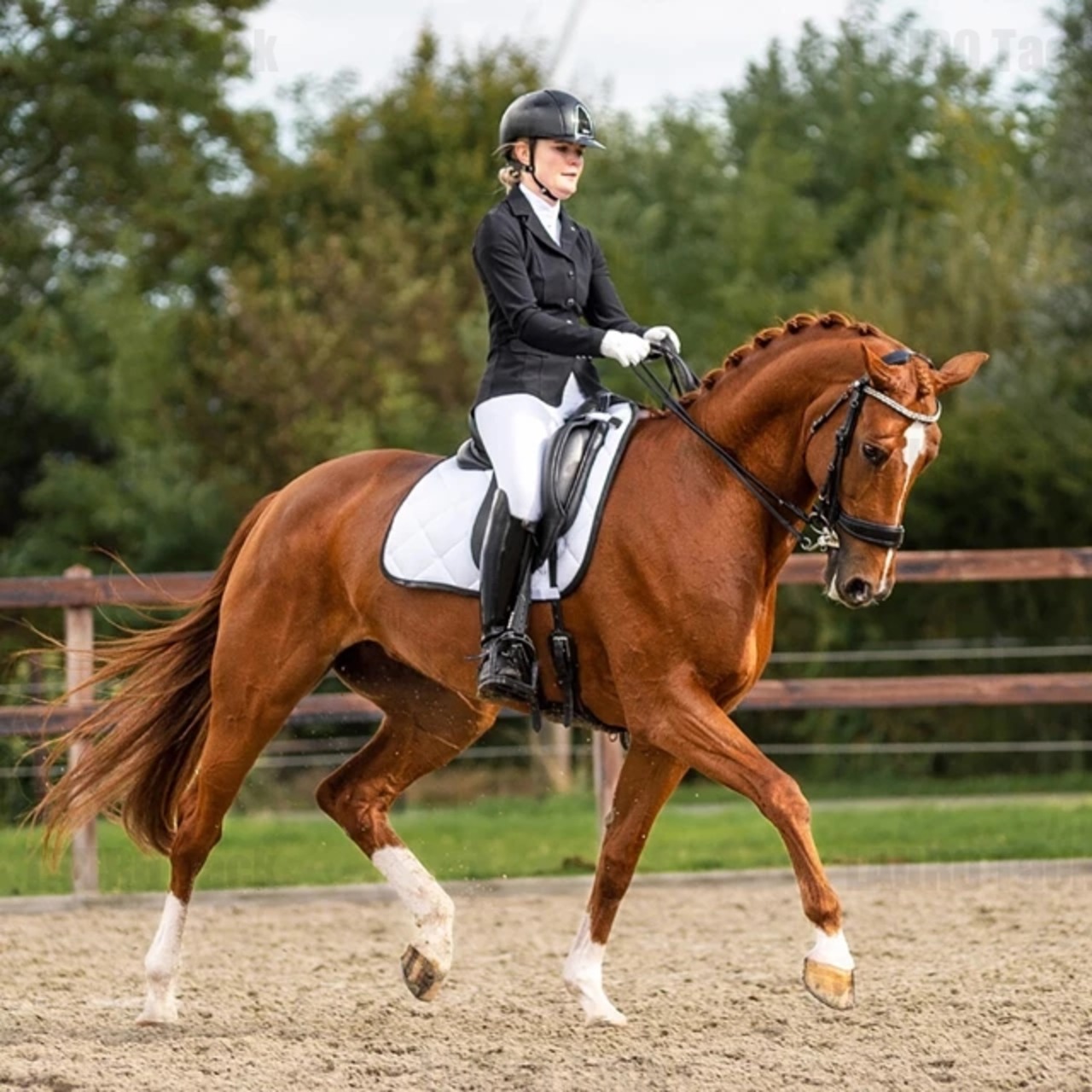 高品質なPresTeqサドルパッドは、Tanatex chemicalsのQi-tex?素材で作られています。エネルギー吸収と反射の特性により、馬の体内の酸素レベルと血液循環が改善されます。通気性があり、最高のパフォーマンスを提供します。プロフェッショナルな外観であり、解剖学的なフィット感と肩甲骨の自由度が優れています。さらに、通気性のあるメッシュのバックライン、ベルクロ付きのガードルとサドルループ、プレステックのピンの装飾があります。重さは300グラムのポリエステル素材です。