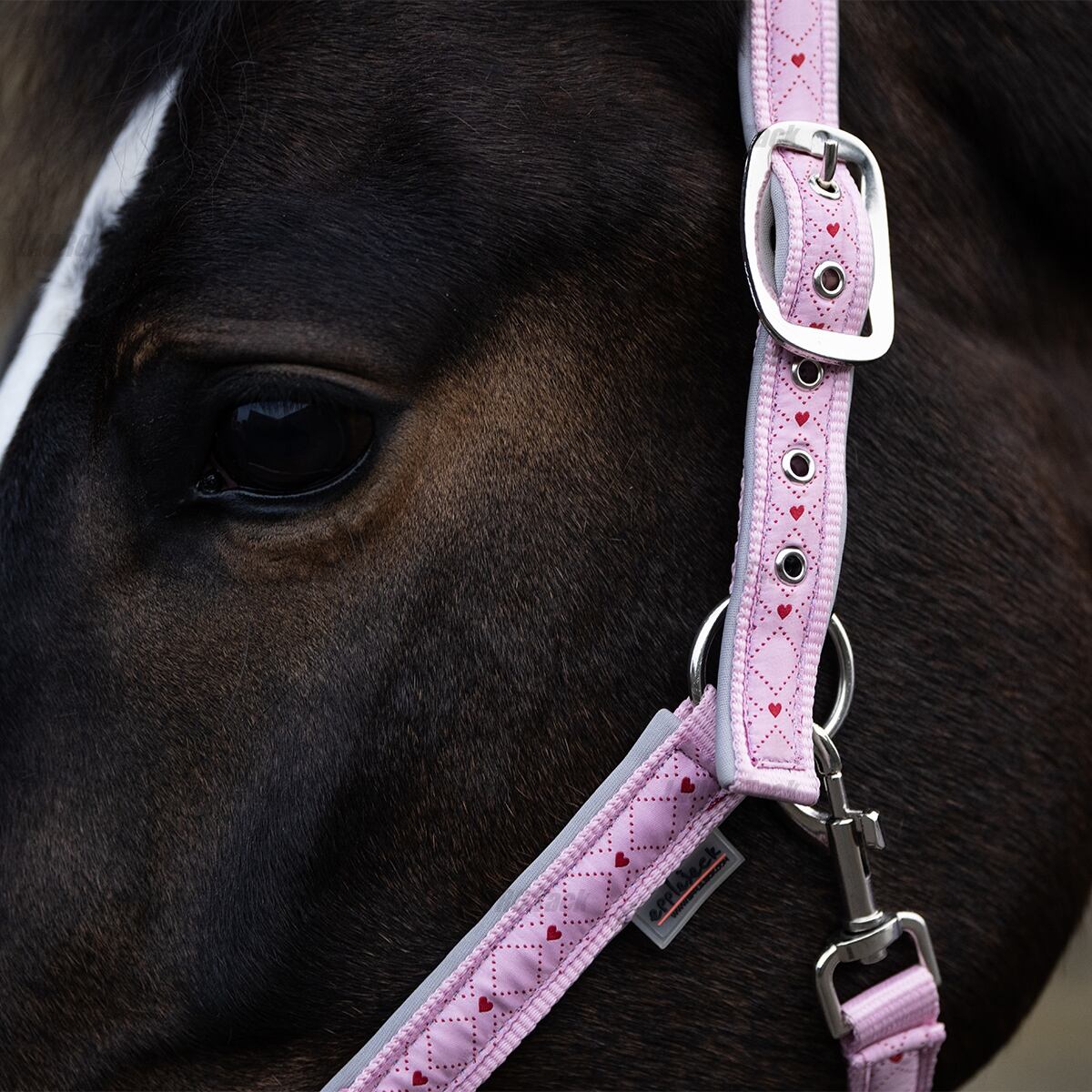 かわいらしいハートのプリントが施されています。この無口は、頭部部分、マウスピース、鼻帯にソフトなネオプレーン裏地が付いており、馬に優しいフィット感を提供します。また、お揃いの無口ロープが付属しており、セットとして完璧です。頭部部分と鼻帯で調整可能なので、馬のニーズに合わせて最適なフィット感を実現できます。