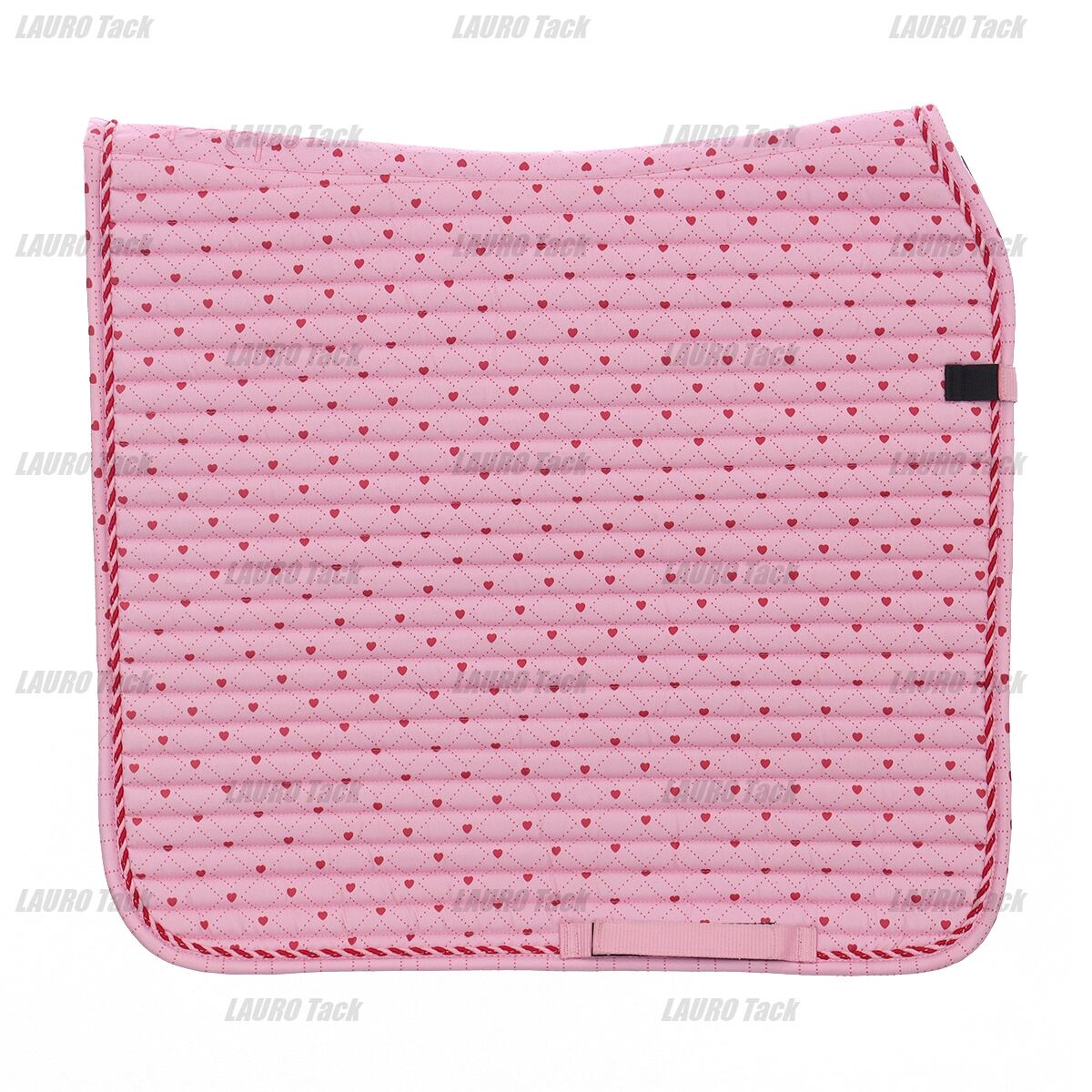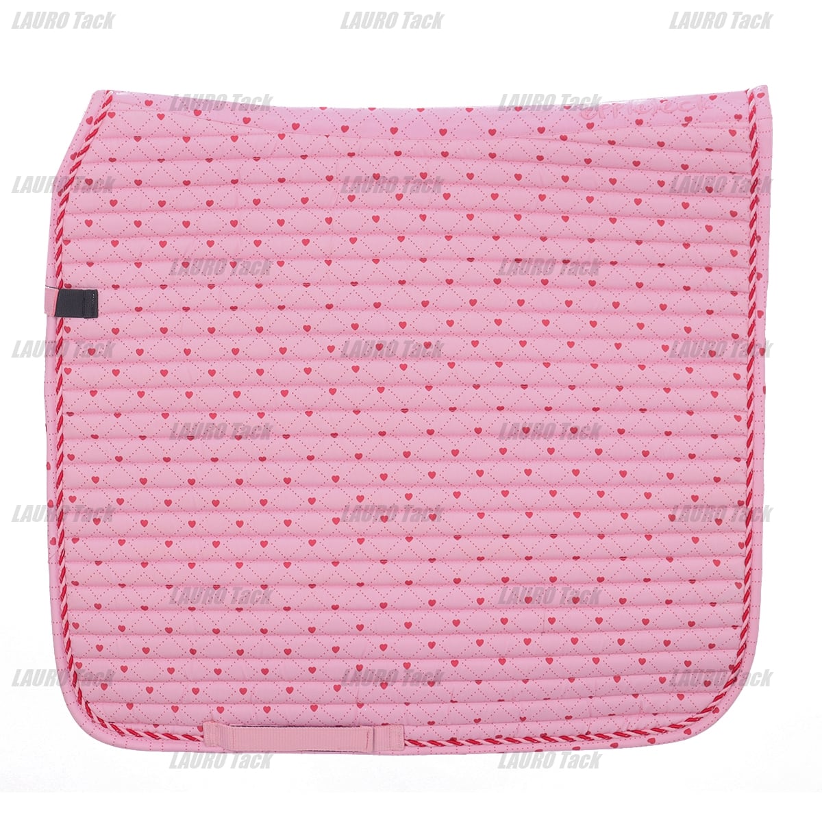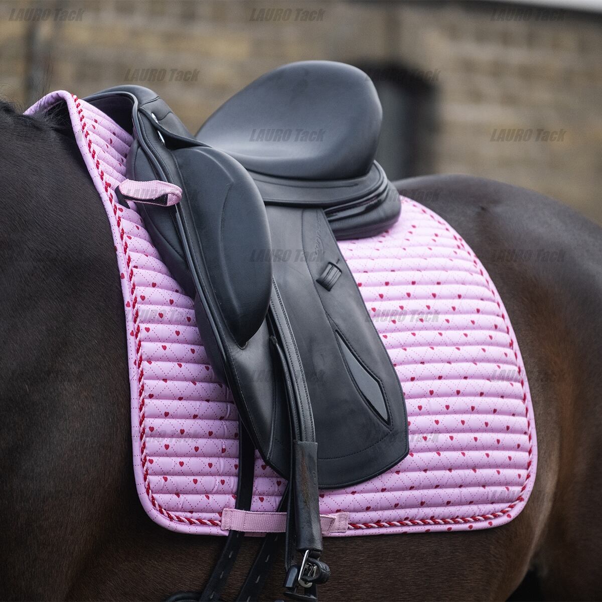 ・ 赤とピンクの全体にハート柄プリント ・ 速乾性のある通気性メッシュ裏地 ・ 解剖学的に形作られた背線 ・ シングルと鞍ループにはマジックテープ付き ・ 二色の装飾コードで飾られています ・ 馬場用
