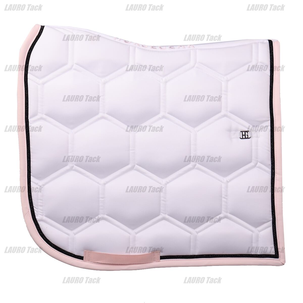 HORSEGEARブランドのHGBrean馬場用ゼッケンは、白いサテンのような素材と印象的なコントラストの縁取りにより、豪華な外観を誇ります。スポーティな六角形のキルティングがこのゼッケンを競技場で本当に目立つアイテムにしています。スタイリッシュな競技ライダーに最適です。